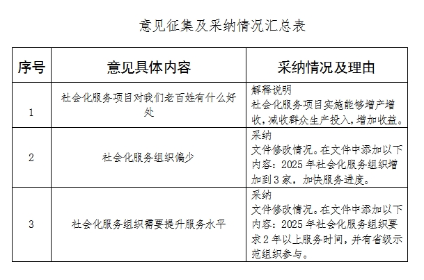 2025年3月26日至2025年4月26日,我局在区政府门户网站对社会公开征集《建安区2025年农业社会化服务项目实施方案》(征求意见稿)文件修改意见,现就意见征集情况公示如下: