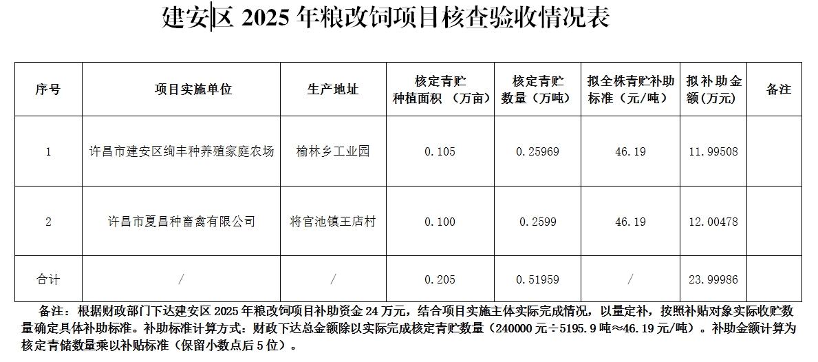 为推进农业种植结构调整,促进农牧结合生态循环发展。按照省、市2025年粮改饲项目实施方案等文件精神,2025年,建安区实施了粮改饲项目,上级项目任务下达建安区核定面积0.2万亩,全株青贮玉米0.5万吨,财政补助资金24万元,主要用于全株青贮玉米收贮补贴,补贴标准每吨不超过60元,采取“先收贮后补贴,以量定补”的原则,全省统一每立方米全株青贮玉米折合0.8吨,根据补贴对象实际收贮数量确定具体补助标准。经企业自愿申报,许昌市建安区绚丰种养殖家庭农场、许昌市夏昌种畜禽有限公司为我区2025年粮改饲项目实施主体,签订了项目目标任务书,项目任务完成后,我单位核查验收组通过对项目实施主体实地查看、查阅资料、丈量测算等方式进行了核查验收,验收情况拍照存档。经核查验收,项目实施单位实际完成收购全株青贮玉米种植面积0.205万亩,全株青贮玉米0.51959万吨,超额完成任务(具体情况见附件)。现将验收情况从11月28日-12月4日进行公示,如有异议的,请于公示期内向区纪委派驻纪检组、区农业农村局或区农牧业服务中心反映,监督电话:0374-7389659。