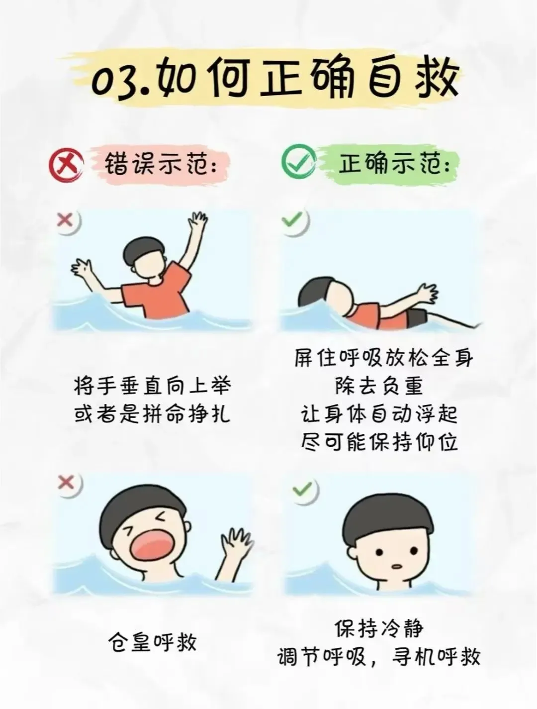 1.?如何自救?保持冷静:慌乱会加速体力消耗,尽量放松身体,采取仰漂姿势等待救援。?利用浮力:抓住身边的漂浮物(如空水瓶、木板等)。?呼救:挥手并大声呼救,吸引他人注意。
