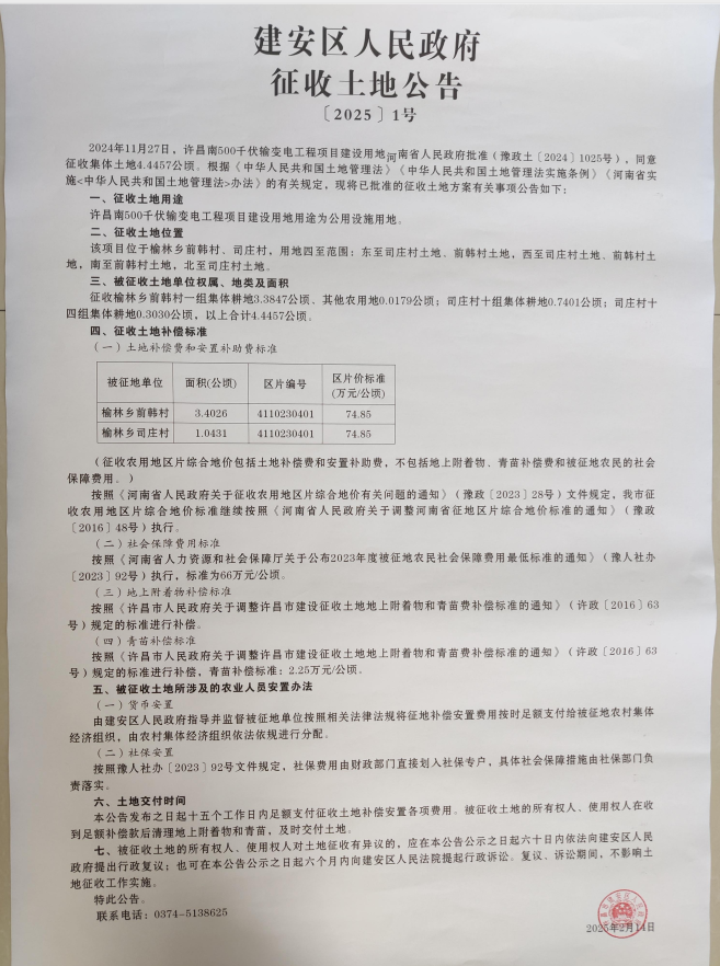 建安区政府征收榆林乡前韩村、司庄村土地公告