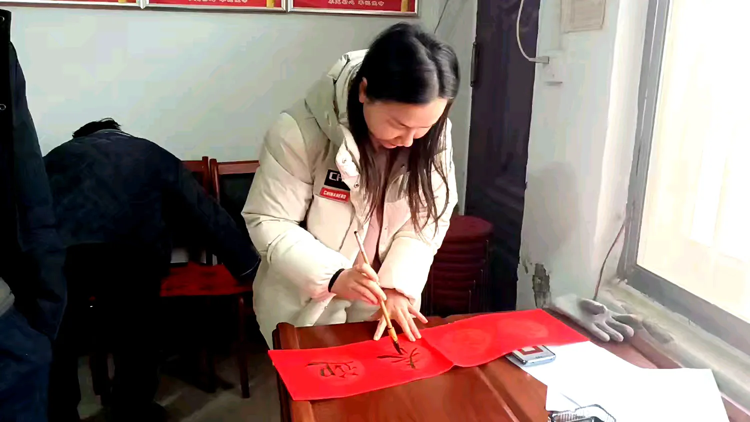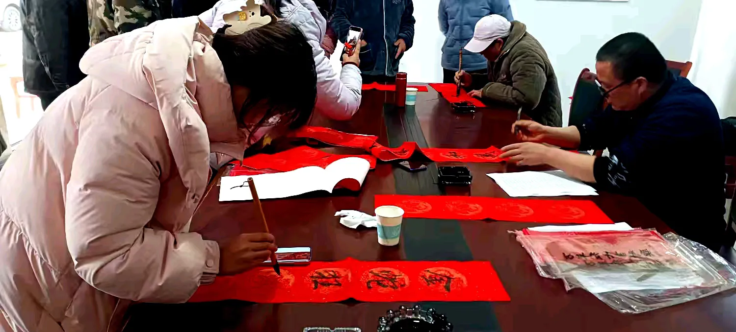 王俊锋老师等几位书法家写上了满满的祝福。建安区文联副主席周晓丽、乡组织委员魏喜平、文化站长朱丽平,村里的文化能人刘保和等都拿起毛笔龙飞凤舞,激扬文字,送上了最美好的祝福。把文化送到农村,把百福迎春的福字写给群众,大家热热闹闹,帮忙摆放春联,红彤彤、喜洋洋的年味儿马上就来了!群众定制内容,书法家按群众要求写春联、读春联,祝福语不断!群众们的笑声和幸福感,充满了村部大院,文化氛围立刻就浓厚了!春联既有诗情画意,有杨柳吐新、又有山河锦绣、有五谷丰登,真的是祝福满满!领到春联的群众高兴的合不拢嘴!