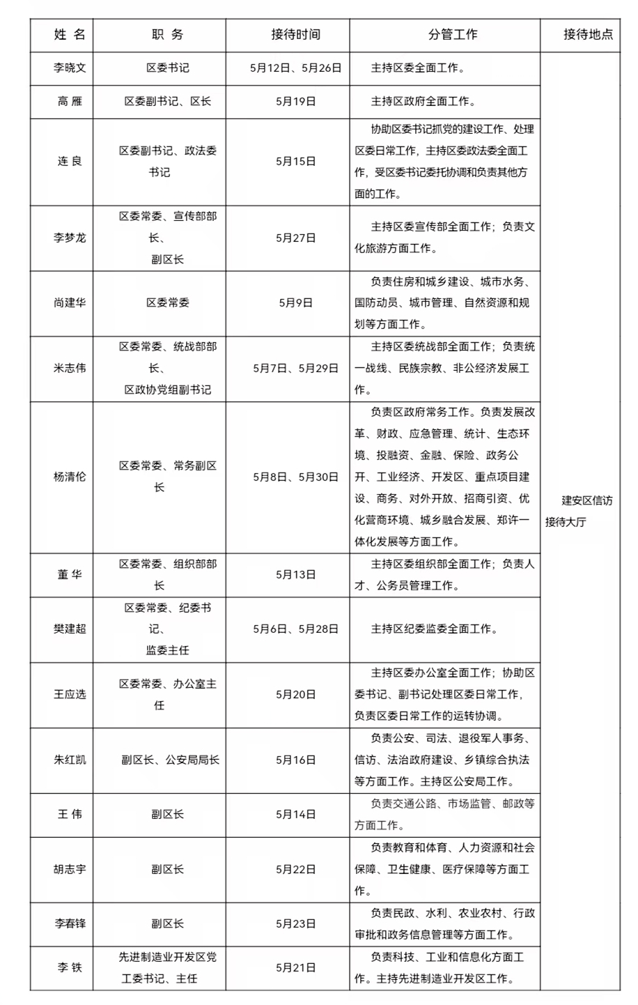 2025年5月份建安区党政领导干部公开接待群众来访日程表