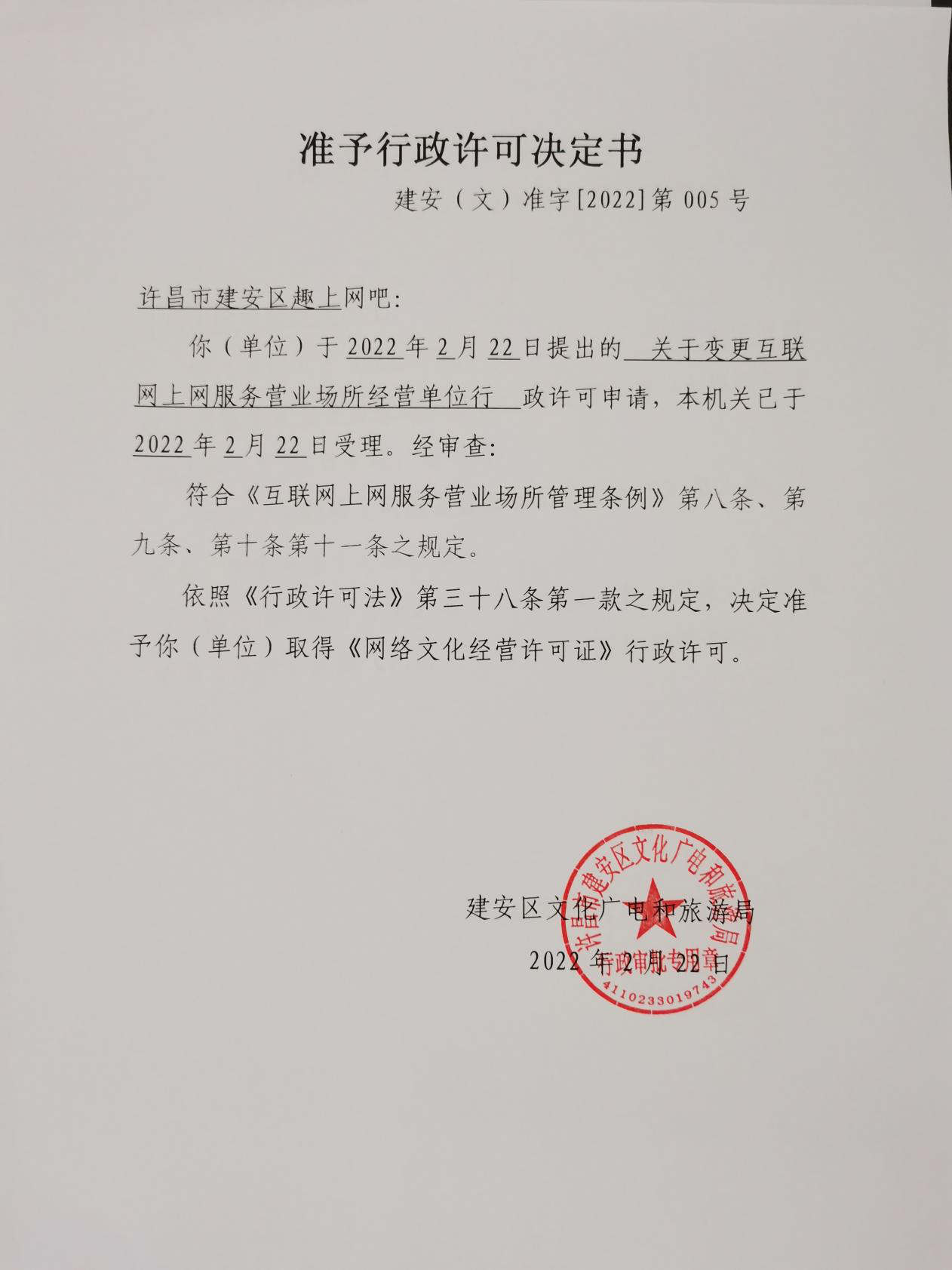 许昌市建安区趣上网吧准予行政许可决定书