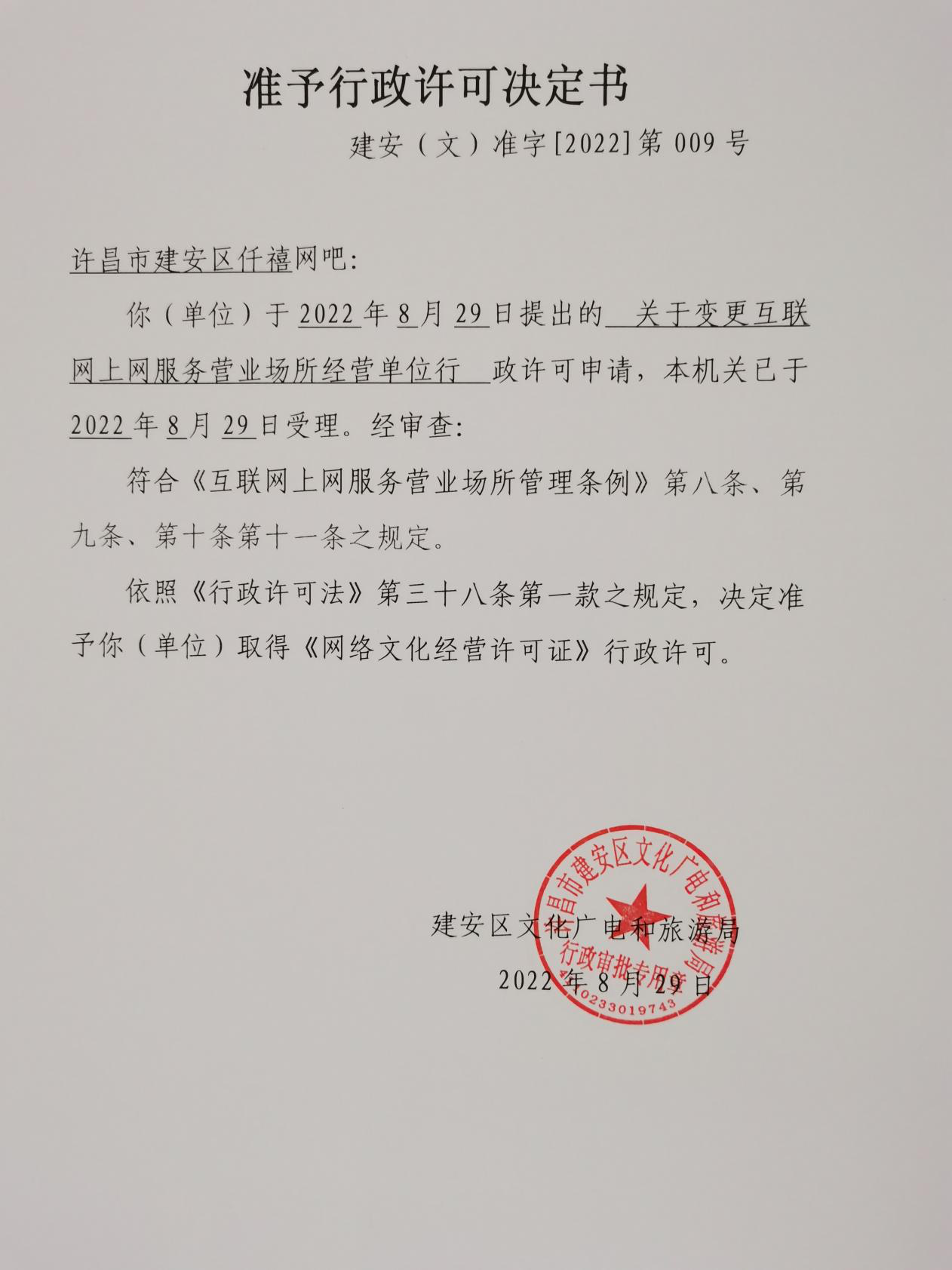 许昌市建安区仟禧网吧准予行政许可决定书