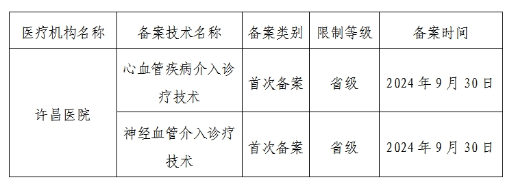 为进一步加强对我区医疗技术临床应用的监管,按照《医疗技术临床应用管理办法》《河南省卫生健康委关于进一步加强医疗技术临床应用监管工作的通知》(豫卫医〔2019〕21号)等规定要求,现对许昌医院开展限制类医疗技术临床应用备案情况进行公示。公示期为2024年9月30—12月30日。