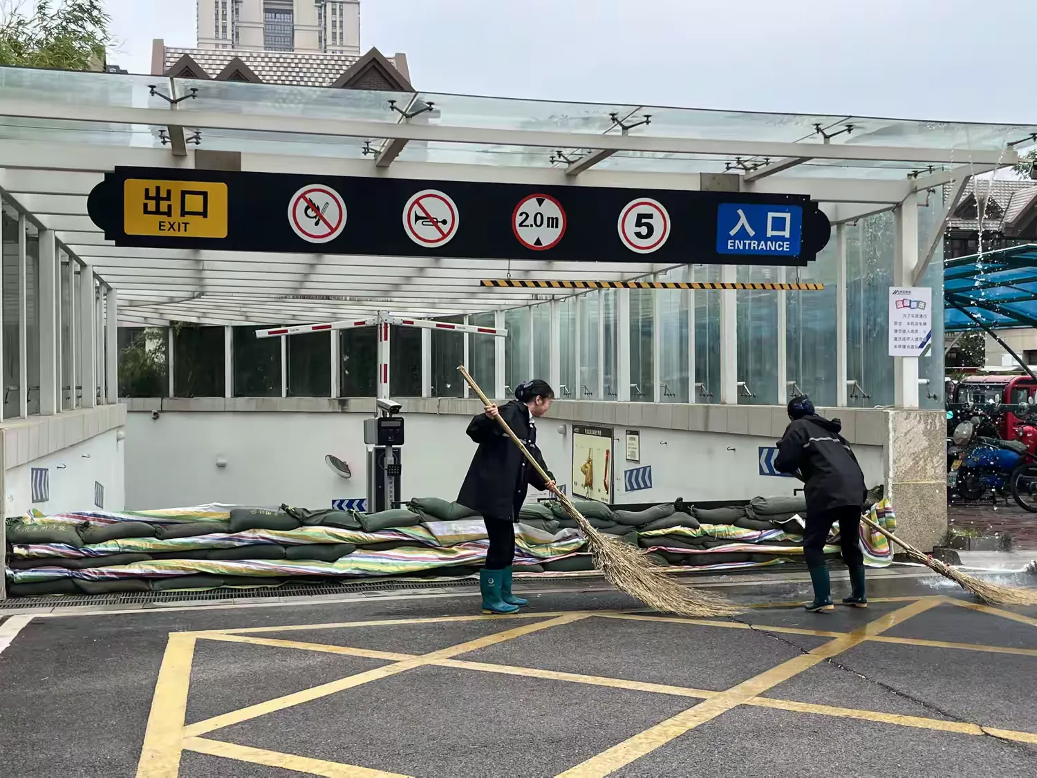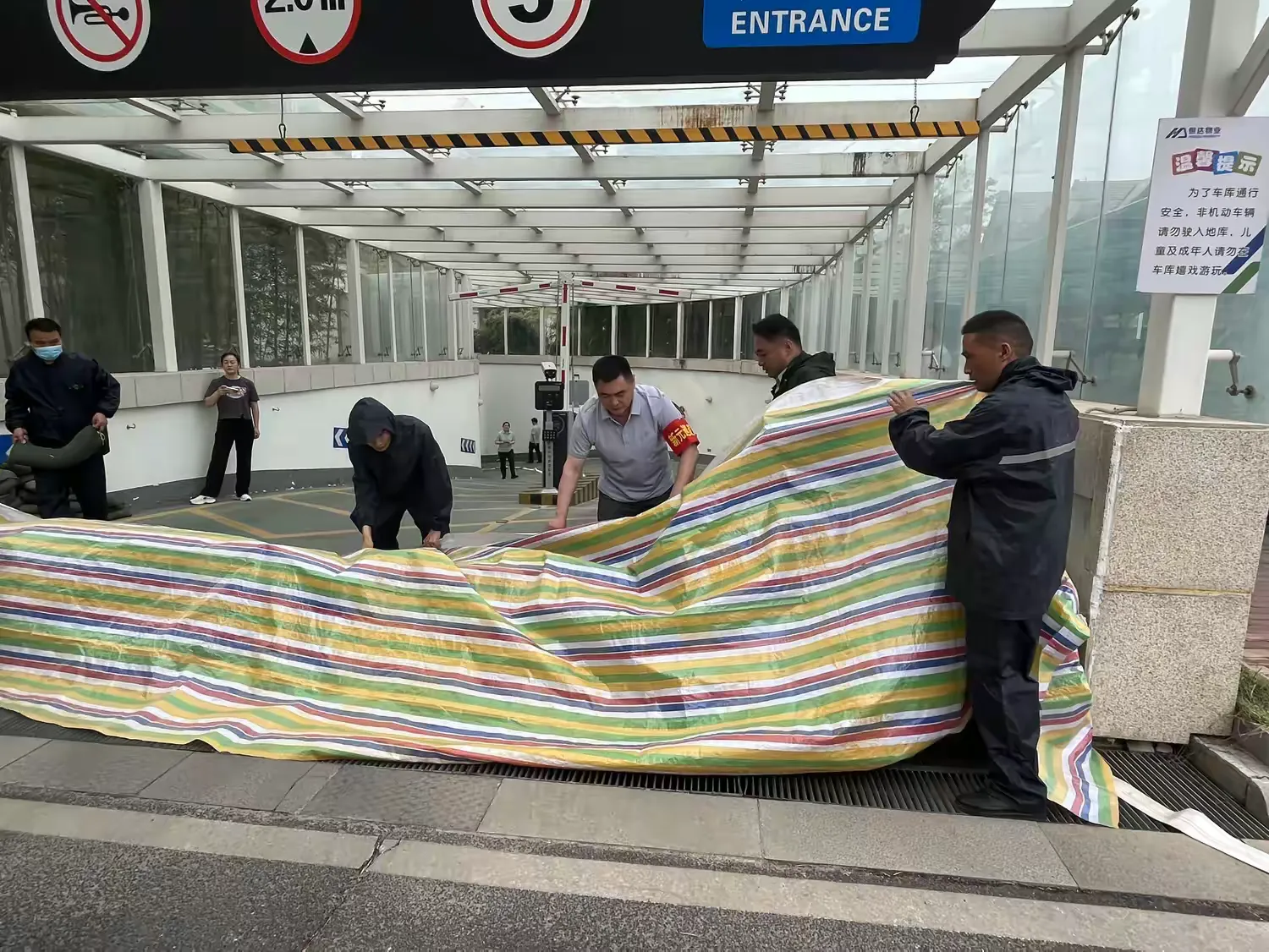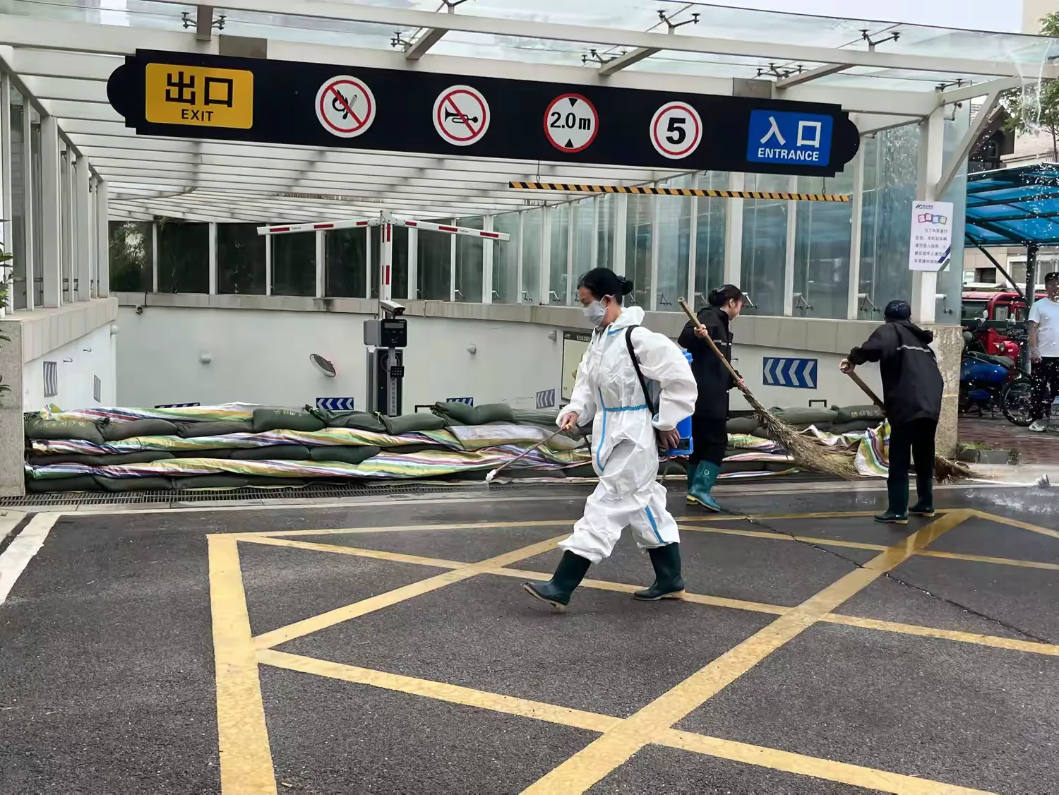 环境组对汛期污水流入过的车库内部环境及周边外围喷洒消毒药剂,进行无死角全覆盖彻底消杀,确保灾后不发生疫情。