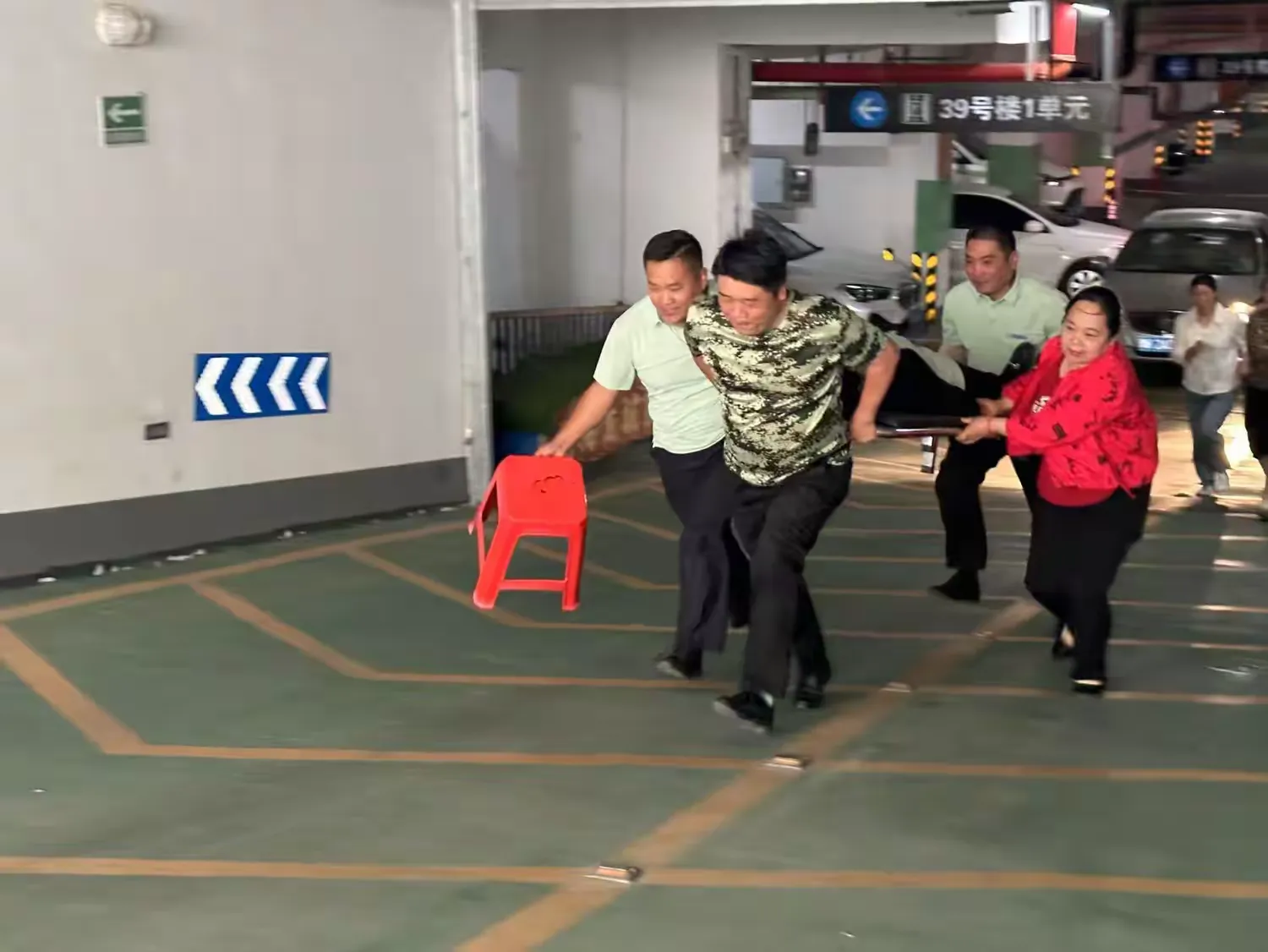 疏散组为避免业主财产损失,紧急转移业主物资,及时通知业主挪车,引导车辆停放至安全地带,并对车库内的人员进行引导疏散。