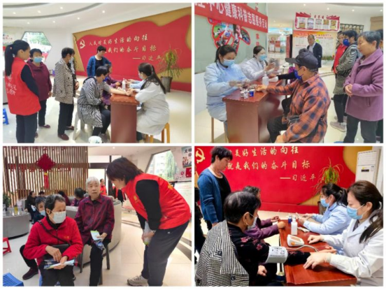 活动结束后,志愿者为社区居民量血压、测血糖、健康咨询等健康服务,为社区居民发放宣传页、倡议书、灭鼠版、湿巾、围裙、水伞等,引导居民养成健康生活方式。