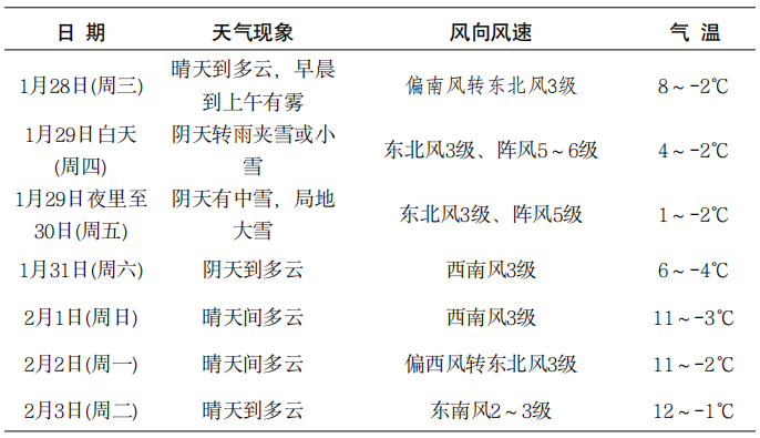 受西南暖湿气流和冷空气共同影响,预计1月29日至30日我市有一次中等强度降雪天气。29日(周四)傍晚到30日(周五)白天全市雨夹雪转中雪,局地大雪,30日(周五)傍晚前后降雪停止转阴天,积雪深度2~4厘米。29日至30日最高气温较前期下降5~6℃,将出现较明显的道路结冰;近日及降雪天气前后空气湿度大,部分时段能见度较低。