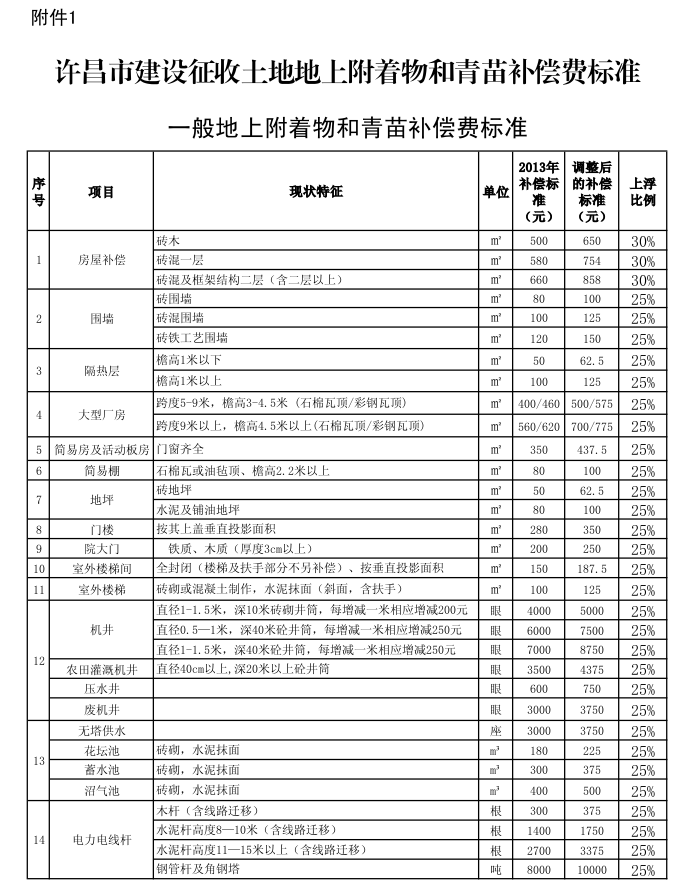 2.许昌市建设征收土地地上附着物和青苗补偿费标准的说明