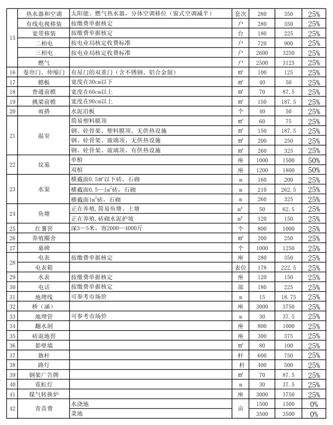 2.水渠补偿包括旧料搬运、材料损失、拆建工费等。