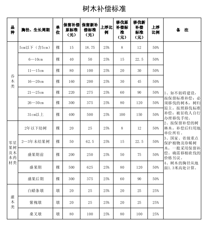 1.移植树木,在非移植季节,按保留补偿。花木、苗圃及树林按照园林部门规定或本地区当年度(当季)市场价格补偿。
