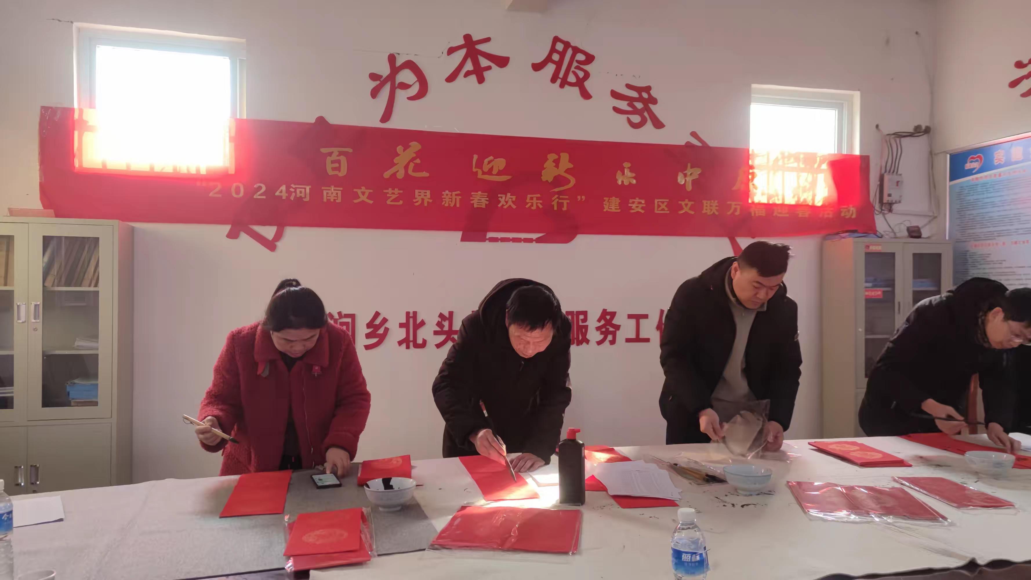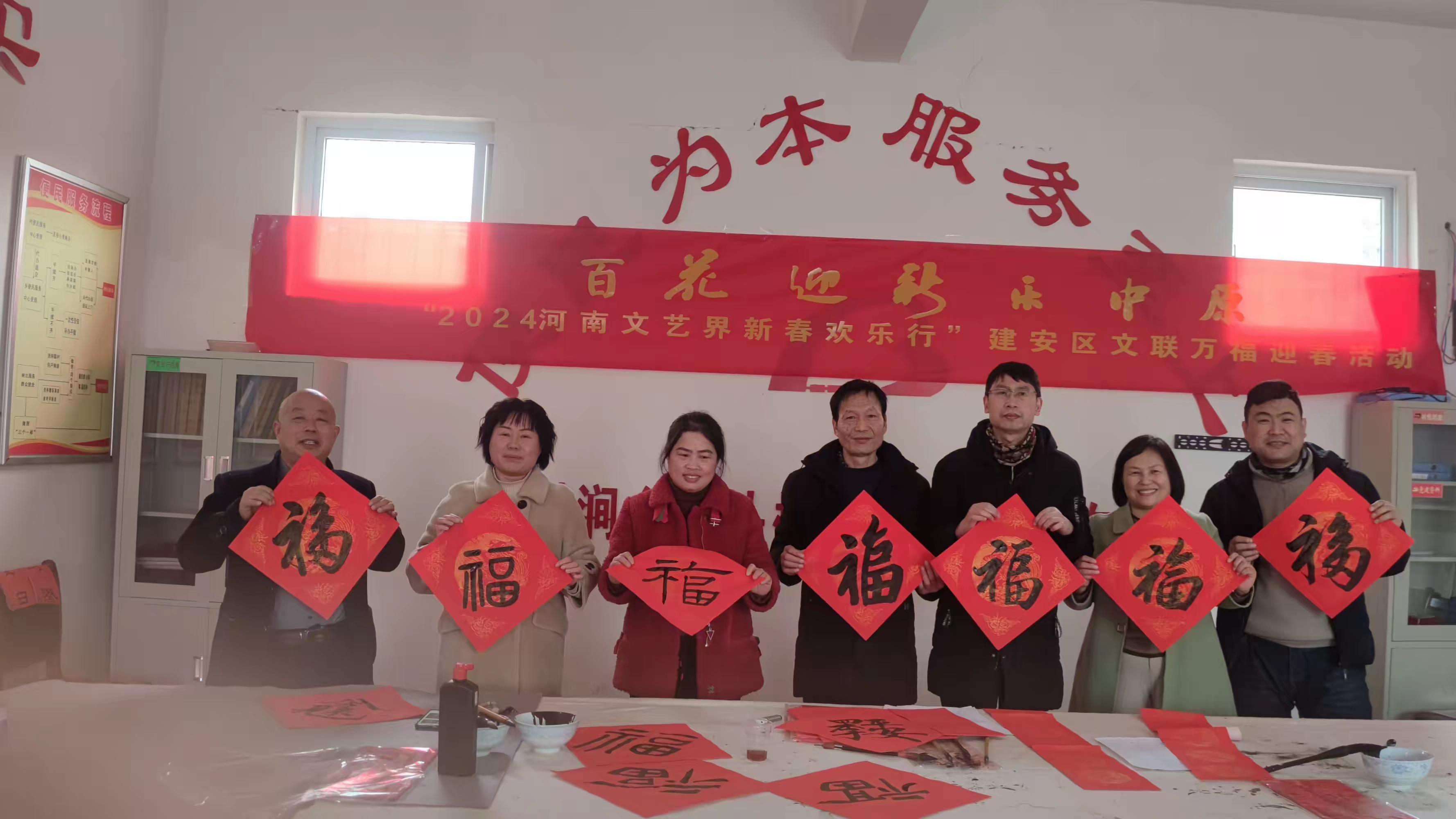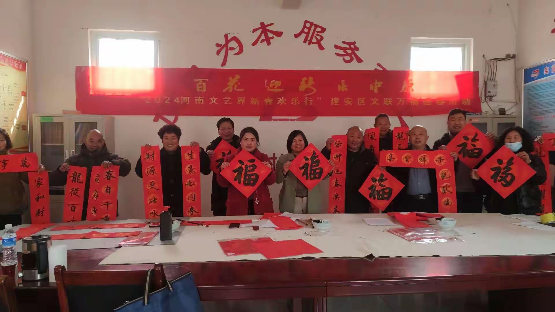 为了助推五星支部创建,提升幸福文明星工作实效, 2024年1月24日上午,建安区文联组织书法家与椹涧乡人民政府联手到椹涧乡北头社区举行写春联活动。由文联副主席周晓丽带队,一行五人来到了椹涧乡北头社区。挥毫泼墨,用寓意美好的春联,给群众送来了新年的祝福。把文化送到农村,把百福迎春的福字写给群众,大家热热闹闹,帮忙摆放春联,一片红彤彤、喜洋洋的年味儿马上就来了!领到春联的群众高兴的合不拢嘴!写春联、读春联,祝福语不断!文化氛围立刻就浓厚了!春联既有诗情画意,有杨柳吐新、又有山河锦绣、有五谷丰登,真的是祝福满满!