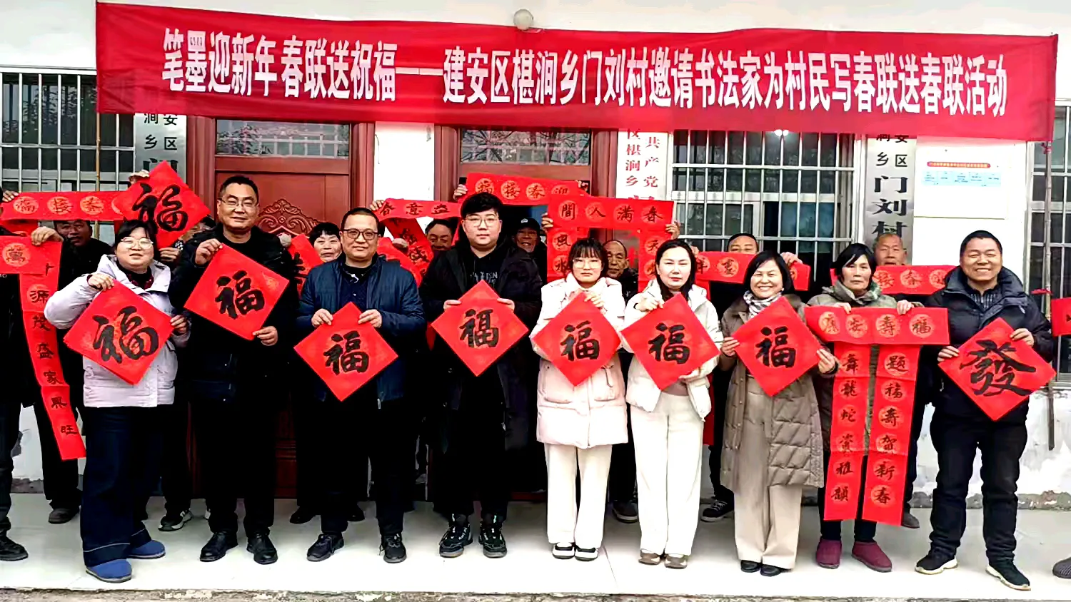 为了助推五星支部创建,提升幸福文明星工作实效,给村民送去新春的祝福。 2025年1月23日上午,建安区文联组织书法家与椹涧乡人民政府联手到门刘村举行写春联送春联活动。由文联副主席周小丽带队,一行四人来到了椹涧乡门刘村。挥毫泼墨,新春福至,用寓意美好的春联,群众送来了新年的祝福。