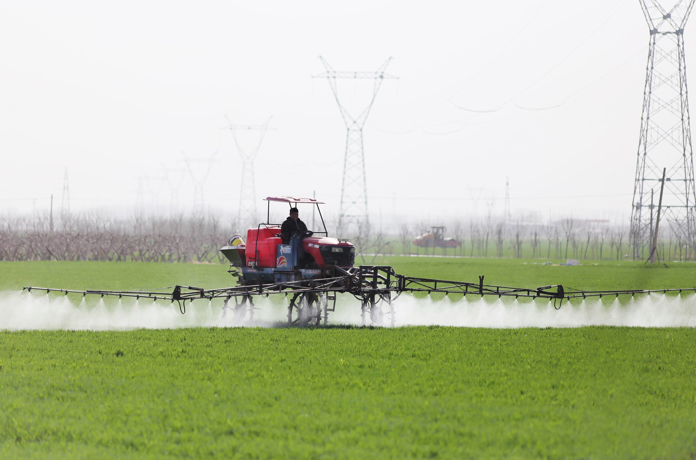 3月19日,建安区陈曹乡双楼张社区,一辆农用机械正在田间来回穿梭喷施农药。当前,我市各地农民抢抓气温回升、天气晴好的有利时机,积极开展田间春管,确保夏粮稳产增产。