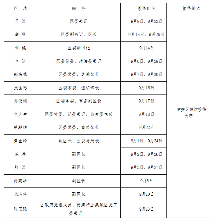 为畅通信访渠道,倾听群众心声,变群众上访为领导主动接访、约访,有效推动群众反映的信访问题依法依规按政策及时就地得到妥善化解,我区在全区范围内集中开展党政领导接待来访群众工作。现将我区党政领导信访接待日程安排如下: