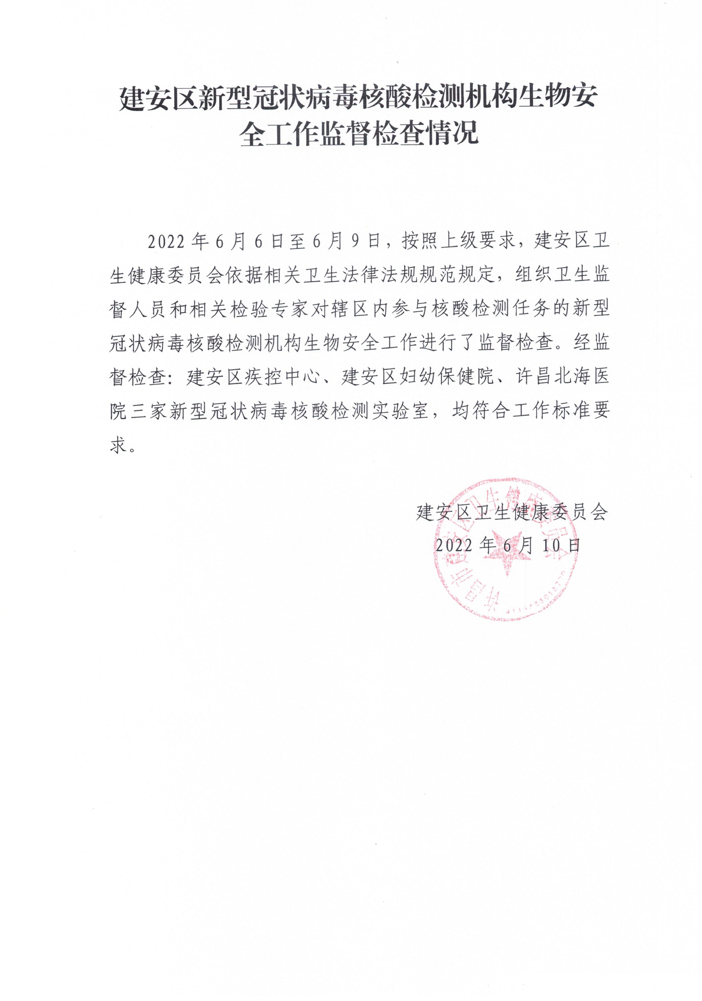 建安区新型冠状病毒核酸检测机构生物安全工作监督检查情况