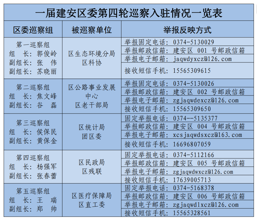 按照建安区委统一部署,一届区委第四轮巡察共派出5个巡察组,对区直工委、老干部局、团区委、科协、残联、民政局、医疗保障局、统计局、公路事业发展中心、生态环境分局开展常规巡察。