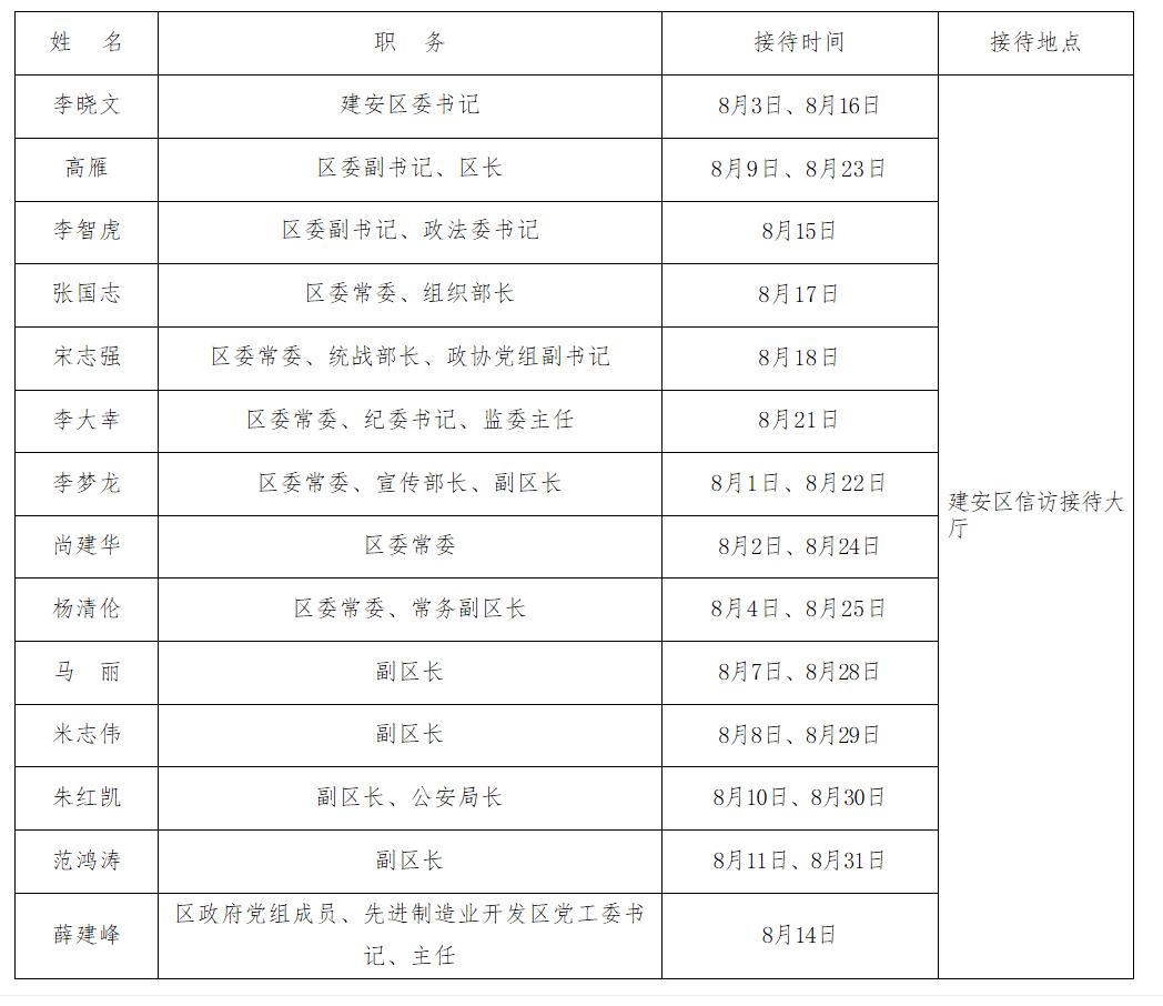 2023年8月份建安区党政领导干部公开接待群众来访日程表