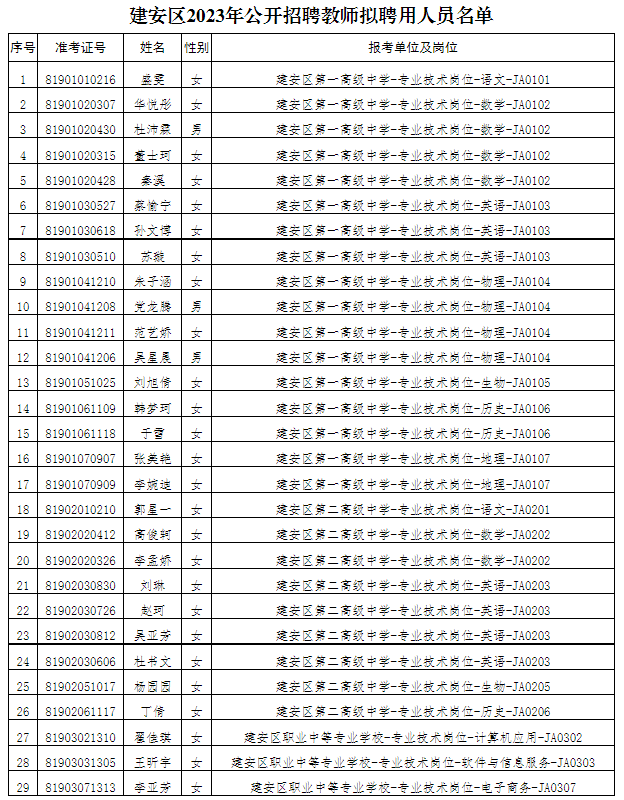 按照《许昌市建安区2023年公开招聘教师简章》要求,经过报名、笔试、面试、体检、考察等程序,根据考试总成绩并结合考察结果,现将建安区2023年公开招聘教师拟聘用人员名单进行公示。
