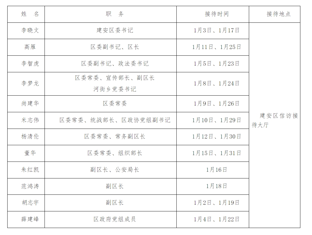 2024年1月份建安区党政领导干部公开接待群众来访日程表