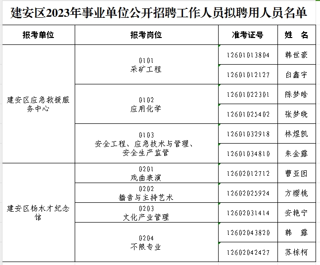 根据《建安区2023年事业单位公开招聘工作人员公告》要求,现将建安区2023年事业单位公开招聘工作人员拟聘用人员名单进行公示,公示期为7个工作日(1月29日-2月5日)。