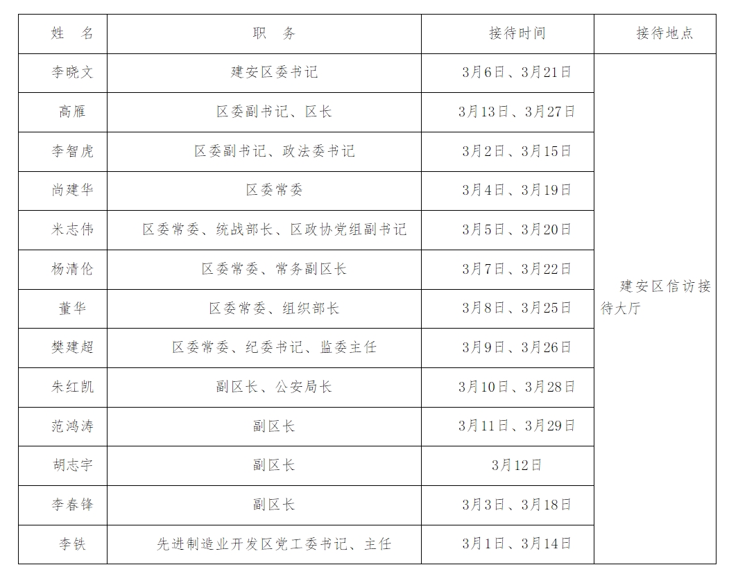 2024年3月份建安区党政领导干部公开接待群众来访日程表