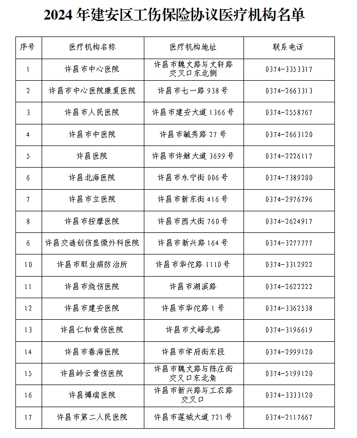 为方便参保人员因工伤就医,保证医疗机构高质量提供医疗服务,根据国务院《工伤保险条例》《河南省工伤保险条例》《人力资源社会保障部关于进一步加强工伤医疗管理服务工作有关问题的通知》(人社部函〔2021〕170号)等有关规定,经各医院自愿申请、建安区人社部门综合考评后,研究确定许昌市中心医院等17家机构为2024年建安区工伤保险协议医疗机构,现予以公布。