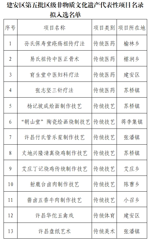 为完善非物质文化遗产名录体系,按照《中华人民共和国非物质文化遗产法》《河南省非物质文化遗产保护条例》等有关要求,建安区文化广电和旅游局组织开展了建安区第五批非物质文化遗产代表性项目遴选推荐工作。经申报材料复核、初审、现场抽查,专家评审委员会评审等环节,确定了拟报请区政府公布的13个非遗物质文化遗产项目名单,现予以公示。