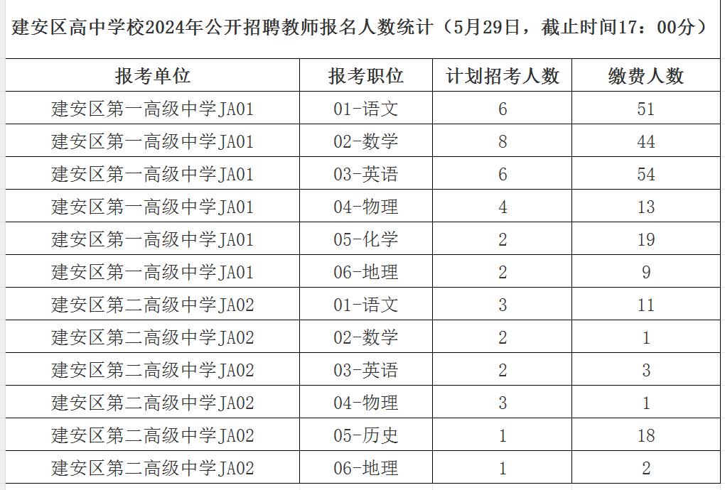 建安区高中学校2024年公开招聘教师报名人数统计(5月29日,截止时间17:00分)