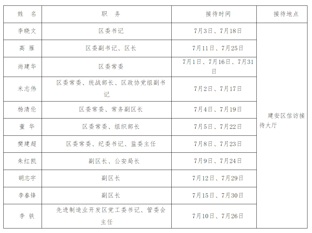 2024年7月份建安区党政领导干部公开接待群众来访日程表
