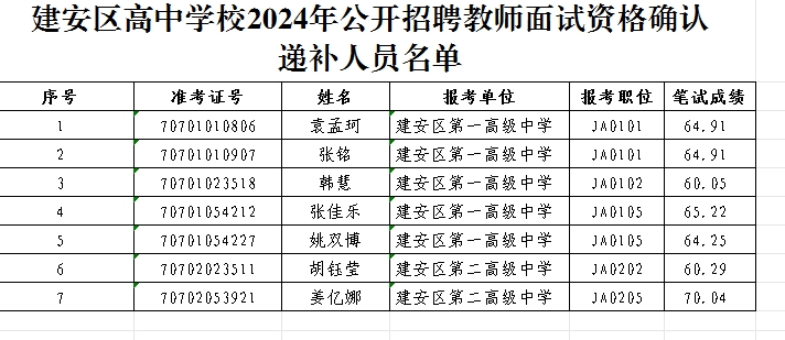 截至7月19日下午17:00,根据岗位面试比例要求和面试资格确认考生自动放弃或被取消面试资格情况,共有7名考生递补,递补人员名单及信息附后。请面试资格确认递补人员认真阅读《建安区高中学校2024年公开招聘教师面试资格确认公告》,按要求带齐相关证书、证件、证明,并于7月22日上午9:00—12:00,到许昌市建安区兴业大厦北楼5155房间(新元大道与镜水路交叉口西北)参加面试资格确认。逾期未到,视为自动放弃面试资格;参加面试资格确认递补人员所提供的有关材料和主要信息不实,或提供材料不完整的,取消参加面试的资格。面试人数仍然出现空缺时,不再递补。