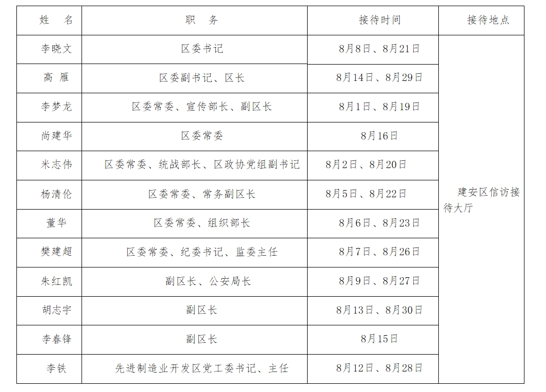 2024年8月份建安区党政领导干部公开接待群众来访日程表