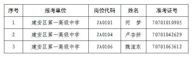 根据《建安区高中学校2024年公开招聘教师公告》和考察递补人员体检情况,进入考察人员共3人。