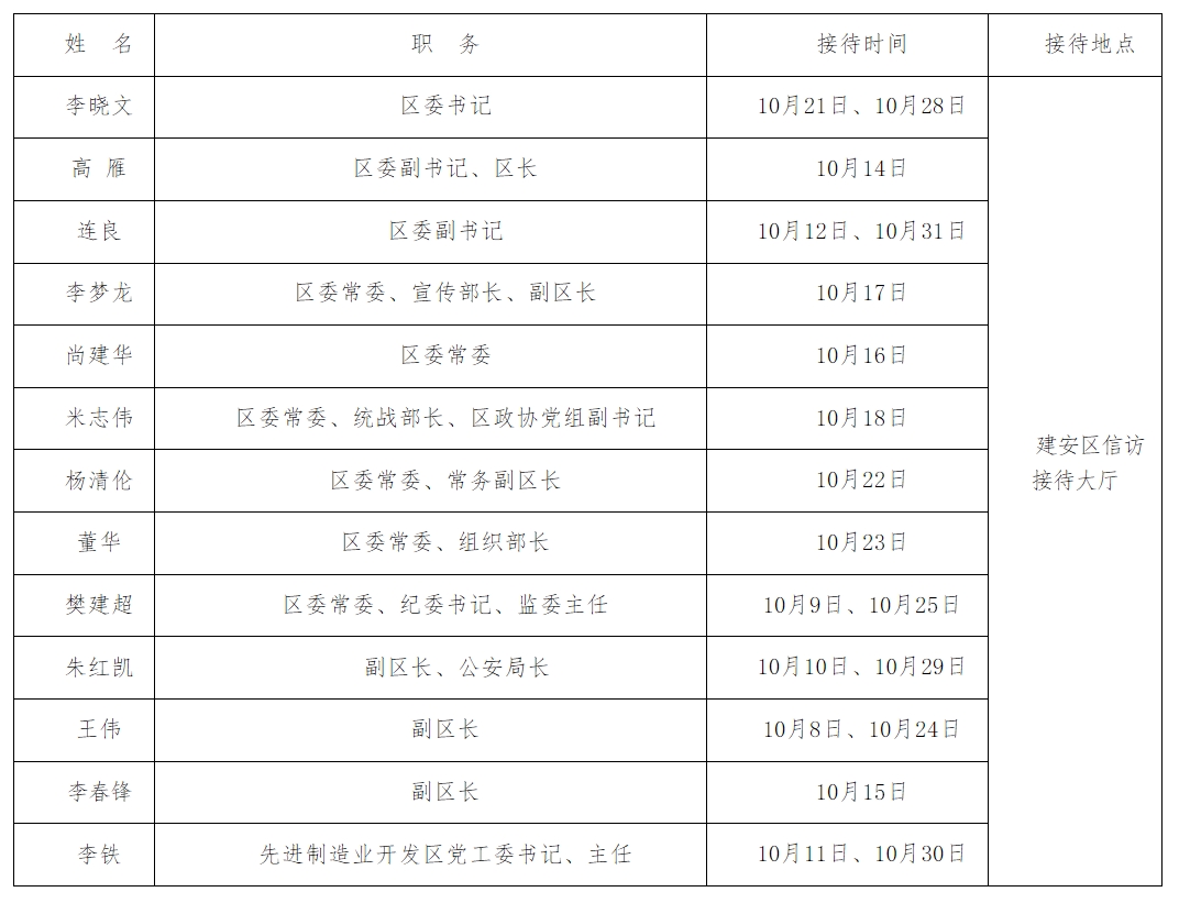 2024年10月份建安区党政领导干部公开接待群众来访日程表
