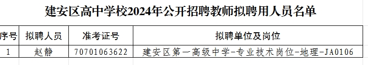 按照《建安区高中学校2024年公开招聘教师公告》要求,现将建安区高中学校2024年公开招聘教师1名孕期考生拟聘用人员名单进行公示,公示期为5个工作日(12月24日-12月31日)。
