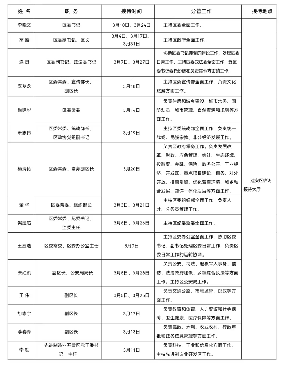 2025年3月份建安区党政领导干部公开接待群众来访日程表