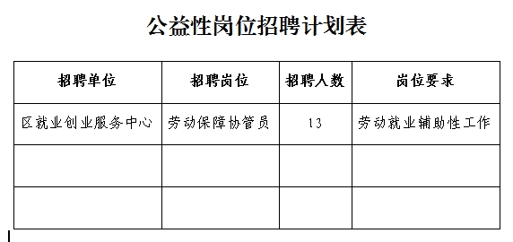 为贯彻落实就业援助政策,有效促进就业困难人员就业,根据《就业促进法》、《河南省就业促进条例》、《河南省公益性岗位管理办法》、《河南省就业补助资金管理办法》等文件规定,结合工作需要,拟面向社会从就业困难人员中公开招聘13名公益性岗位工作人员。现将有关事项公告如下: