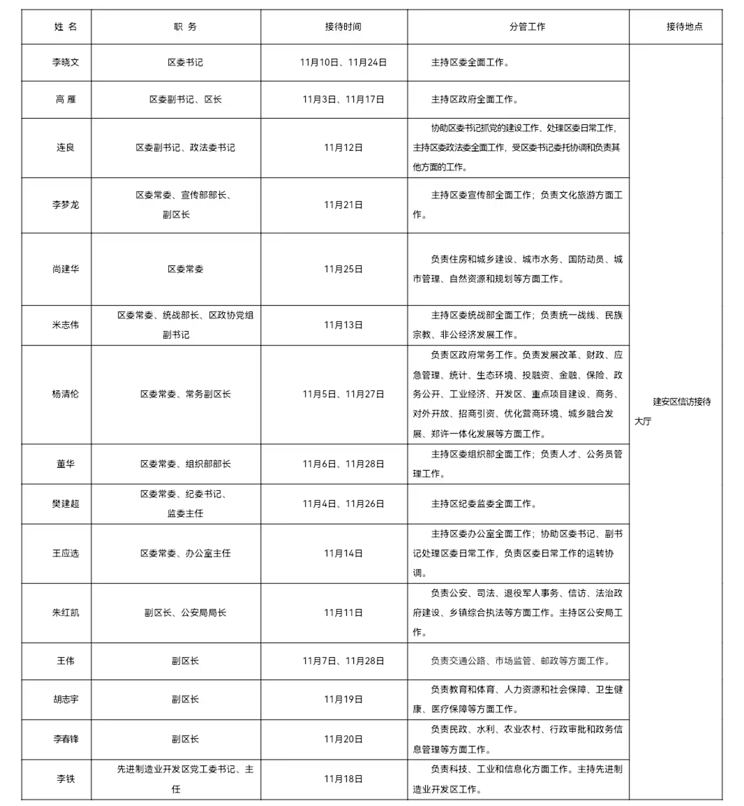 2025年11月份建安区党政领导干部公开接待群众来访日程表