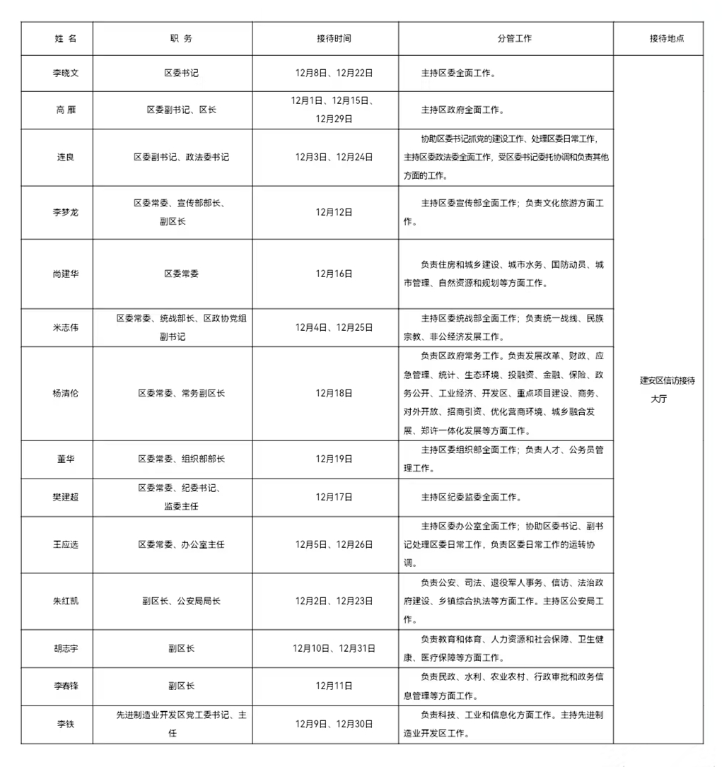 2025年12月份建安区党政领导干部公开接待群众来访日程表