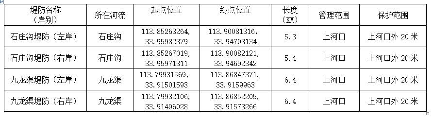 依据《中华人民共和国水法》、《中华人民共和国防洪法》、《中华人民共和国河道管理条例》、《河南省〈河道管理条例〉实施办法》有关规定划定,建安区水利局划定了石庄沟、九龙渠管理和保护范围。现公告如下: