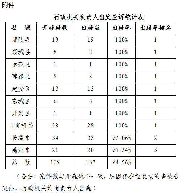 第一季度,许昌市两级法院开庭审理我市一审、二审行政案件137件,出庭135件,行政机关负责人出庭应诉率为98.54%。上述数据中,一审行政案件开庭审理83件,出庭82件,行政机关负责人出庭应诉率为98.8%;二审行政案件开庭审理54件,出庭53件,行政机关负责人出庭应诉率为98.15%。其中,市直机关及鄢陵县、襄城县、魏都区、建安区、城乡一体化示范区管委会、经济技术开发区管委会、东城区管委会行政机关负责人出庭应诉率均为100%(详见附件)。